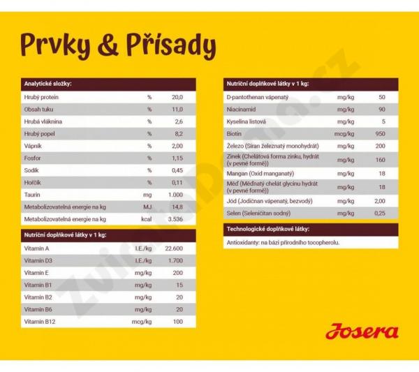 Doplňkové nutriční látky v kg: vitamín A 18.000mj, vitamín D3 1.800mj, vitamín E 200mg, vitamín B1 15mg, vitamín B2 20mg, vitamín B6 20mg, vitamín B12 100mcg, kyselina pantothenová 50mg, niacinamid 90mg, kyselina listová 5mg, taurin 1000mg, biotin 800mcg, železo (sulfát železa, monohydrát) 180mg, zinek (chelát zinku glycin, hydrát) 160mg, mangan 16mg, měď (chelát měďnatý glycin, hydrát) 15mg, jód (jodičnan vápníku) 2mg, selen 0,25mg