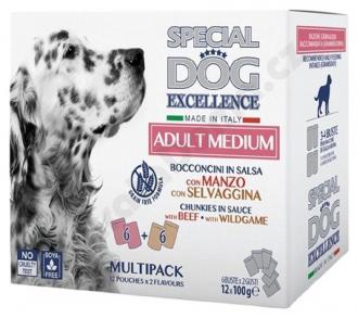 Výhodné multibalení obsahující 12 kapsiček po 100 gramech s chutnými kousky v omáčce pro dospělé psy středních plemen ve dvou různých příchutích:
