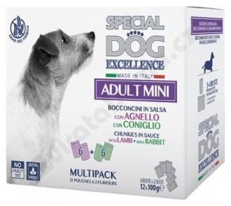 Výhodné multibalení obsahující 12 kapsiček po 100 gramech s chutnými kousky v omáčce pro dospělé psy malých plemen ve dvou různých příchutích: