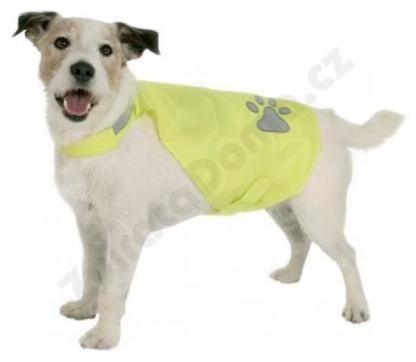 Bezpečnostní vesta určená pro den i noc má reflexní pruhy a tlapku, je nastavitelná na krku i hrudníku.