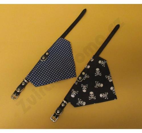 Hladký kožený obojek je vyroben z kvalitní kůže, pro pevnost je obšitý nití do barvy. Je vybaven svařovanými déčky, tak dosahuje maximální pevnosti. Jeho ozdobou je bavlněný šátek v různém designu.